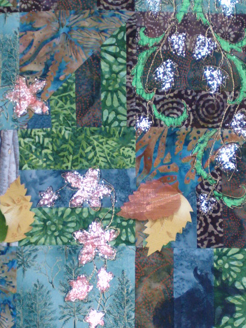 This is a combination of Lumiere paints for the green and rust colors, and using Golden Pearl Mica Flake for the silvery effect. I hadn’t used the Mica Flake before, and feeling the dried effect this morning, I will not be quilting through it. I probably could, but I’ll be quilting around it.