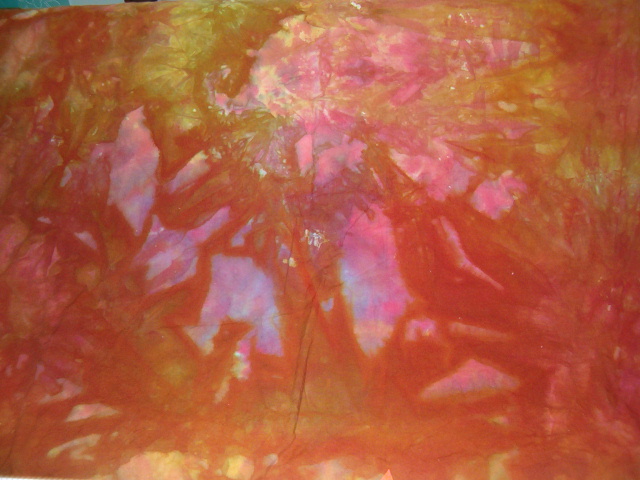 This month’s technique was painted batting, using either acrylic paints or procion dyes. You can see my before (wet in process) pics and my after (dry ready to use) pics here and here.