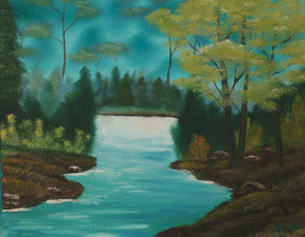 AFTER SUPPER, I decided to rework the above painting. I wasn’t happy with that bridge, I don’t do “structures” well. The advantage of oil is that it was still wet enough to scrape off the bridge and repaint the center section. I think this is much improved now. Not a bad little class painting at all, but now I see a few more things I think I’ll go correct.  Also, the colors in the photo below are truer than the first photo.