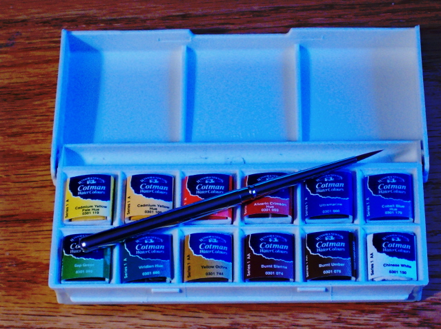 Inside are 12 half pans of basic colors from Winsor & Newton with the cutest little brush, it unfolds and looks like then when open: