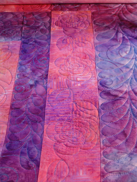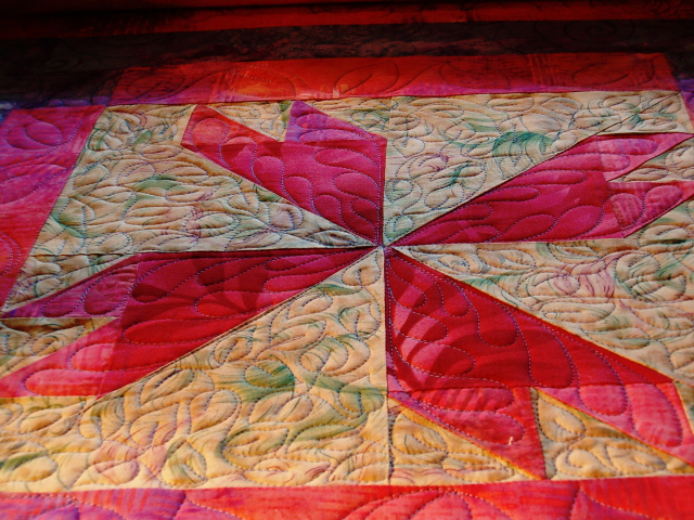 I still haven’t made a decision about the piece in the prior post. And while I try to make up my mind on that one, I am getting some quilting done. Progress on the machine is slow and steady now, the new Edgerider wheels have made a major difference. I have the open toed foot on order, hopefully I’ll receive it next week and that will help as well. Until then, slow and steady, about an hour at a time, but the quilt is advancing.