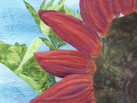 On the artistic/quilting front, I have been fully engaged in thread painting and quilting the sunflower piece. Perhaps today I’ll be able to face it while the longarm is running a panto on a customer quilt.