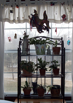 I decided it was past time to move my cactus back into the studio window. They didn’t bloom this winter in the north facing window I had them in. And yesterday morning I knocked over the stand they were on in that window….making quite the mess.