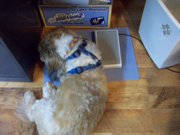 He never touches the foot pedal, but he makes it extremely difficult for me to sit up to the sewing machine any longer.