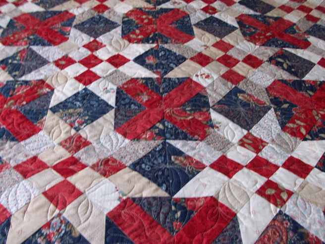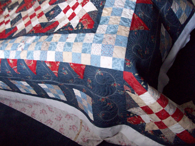 Tomorrow I’ll return the quilt to Susan for binding and displaying at local events. But I thought I’d show some pictures of the quilt, with the quilting.