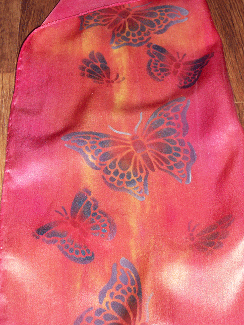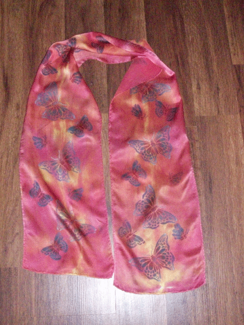 These are just a sample of some of the scarves I have available.  All scarves are silk, hand dyed, some are painted, some are strictly dyed, and all are completely washable.   If you’re interested in a specific scarf either e-mail me, or come visit  my booth at QNAE2010