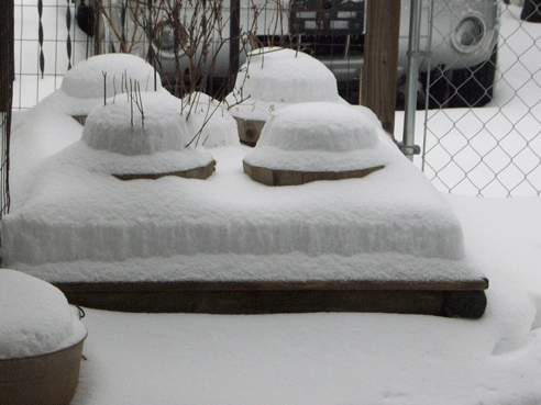 This is the planter box on the back deck that I moved the cedar barrels into this fall.  Aren’t the straight edges of snowfall interesting!