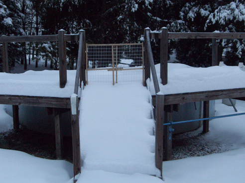 And finally the pool steps.  Not that you can tell there are steps there.  And notice NO SNOW underneath the deck?  We must not have had any blowing winds at all last night.