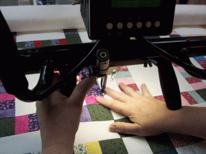 How do I maintain control, first this is done very, very, very slowly; secondly I use my wrist as a stabilizer between the fabric and the machine. The micro handles my husband made are just the perfect height for resting my wrist against: