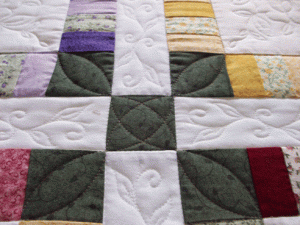 It’s been a slow go, but I think M is going to like her quilt. The final design decisions were made. I did go with both designs we had talked about. A continuous curve to represent chains in the cornerstones and freehand curvy crosshatching in the pieced section of the blocks.