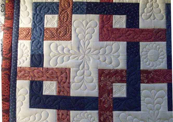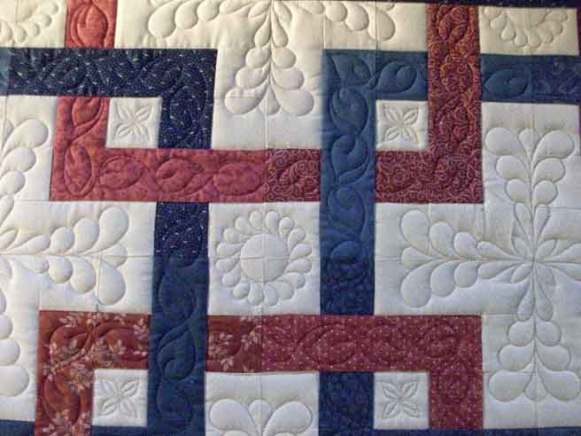 Next up the blocks, or sashings, or ???? This pattern has caught my eye, it’s a lot of negative space with a twined sashing square, so we quilted it with motifs in the negative space and vines that cross over and under in the sashings: