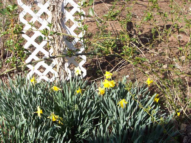 Of course that led to checking out the big garden area. The daffodils are almost past prime there now, but the roses are showing signs of greening up: