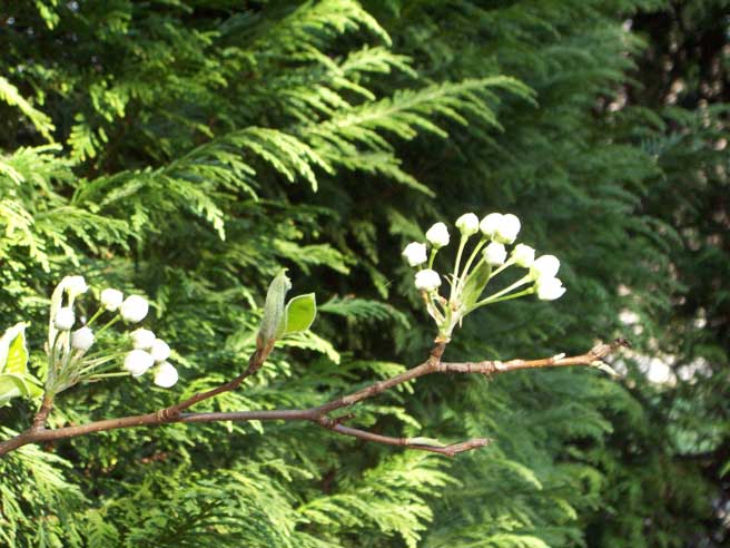 Hmmm, that garden really needs to be re-mulched this year. It’s always something with the gardens and I love it! So, I walked through the roses over to the cypresses by the fence line and peaking through them was a bud from the neighbour’s Bradford Pear trees: