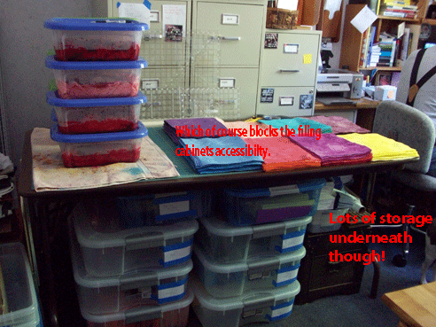 And that makes for cramped corners, where hopefully nobody needs access to any files! But it’s not permanent, just the last 2-3 weeks before a show. Filing can always be done later, right?