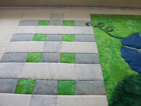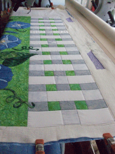 Once I finished the green background, the borders needed to be quilted.  But in order to control the continuous vine on them, the quilt would need to be turned so I can work horizontally along the edge: