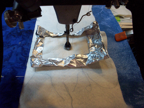 I remember at the time being amazed at how cheaply an oil drip guard could be made!!!!   It’s a doubled over piece of aluminum foil, curled up around the edges of 2-3 layers of cotton batting.  The oil doesn’t go through the foil, and even if, for some unknown reason, a large amount of the oil inside the machine were to run out overnight, the curled edges could prevent the oil from getting onto the quilt or the backing.