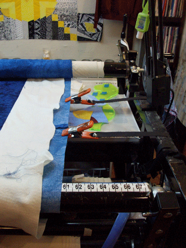 Yes, loaded centered and doing the math, that means this backing is 121″ wide!  This also means I have no place to park the machine.  But, since I designed this quilt for the customer (she pieced it), I felt sure we could work with the larger than normal backing.