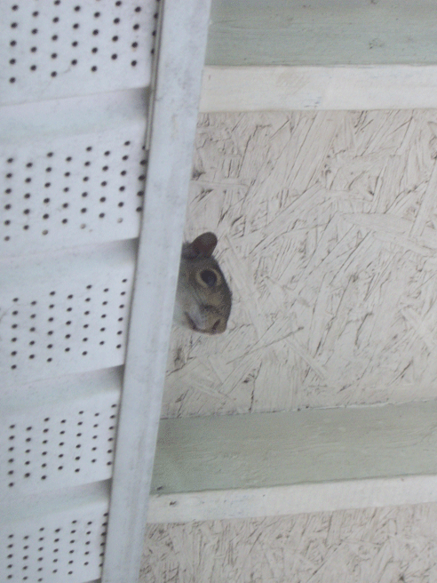 Apparently he was trying to run along the gutter, but kept bumping into the porch roof supports! Silly Squirrel!!!!!!