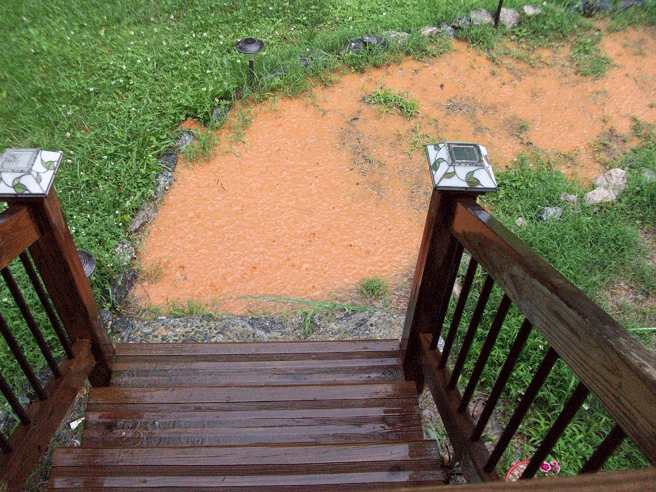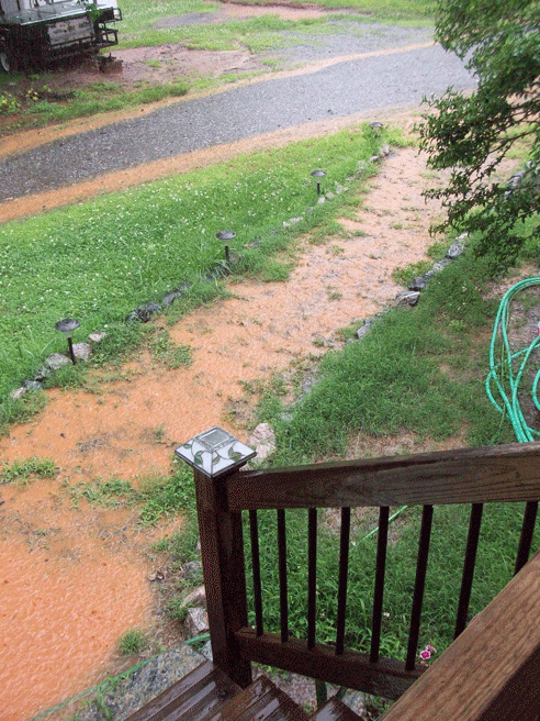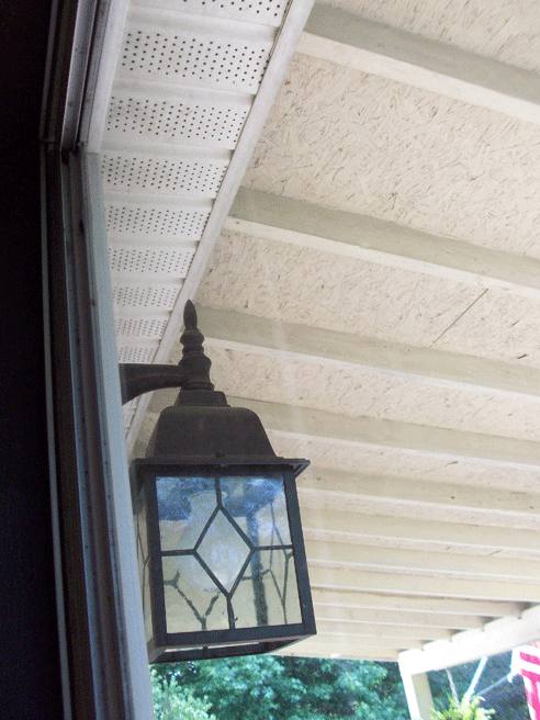 Let’s start with the visitor! Sitting at my computer the other morning, I hear…… scritch, scritch…..scurry, thump!…. scritch, scritch, scurry, thump!…. repeatedly over and over! Now this is the normal view out my front door to the porch roof: