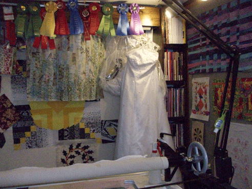 Sounds like the thunderstorms are getting closer, so I think I’ll shut down all the electronics now and take the scissors to that wedding gown! YES! I said CUT IT UP!!!!!! It’s one of my personal favorite projects right now. No, it’s not mine, it’s for friends who are expecting their first child. This was the gown she wore when they married, which I, at that time, altered to fit her (and made her bridesmaids gowns as well). Now I get to cut it totally apart and make a Christening outfit and quilt for their first child! I watched her husband grow up from a young boy and can’t wait to meet their little one this fall!