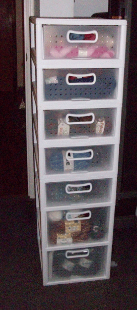 Isn’t it great! It’s plastic, so it’s lightweight if I need to move it. It’s stackable, so I can organize the yarn just by moving the drawers to a different spot in the tower WITHOUT having to unload the drawer and reload a different one. And it was on SALE at Target yesterday. The holes in the fronts of the bins allow air flow, and I can see what I have at a glance.