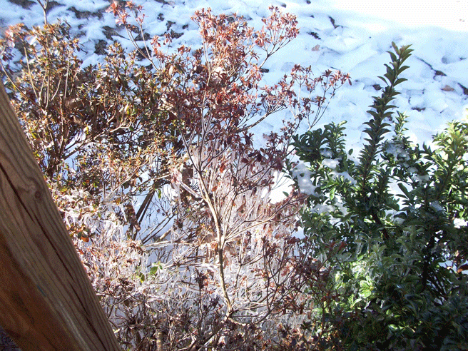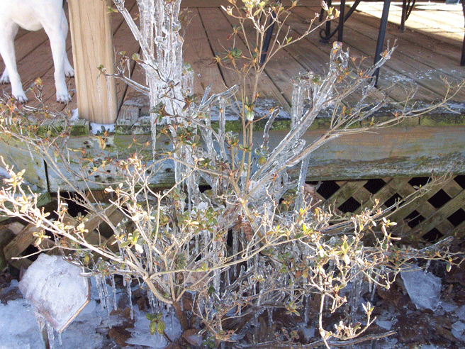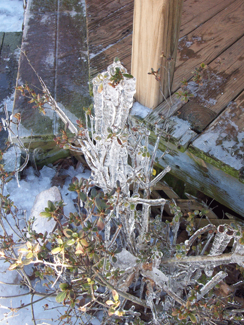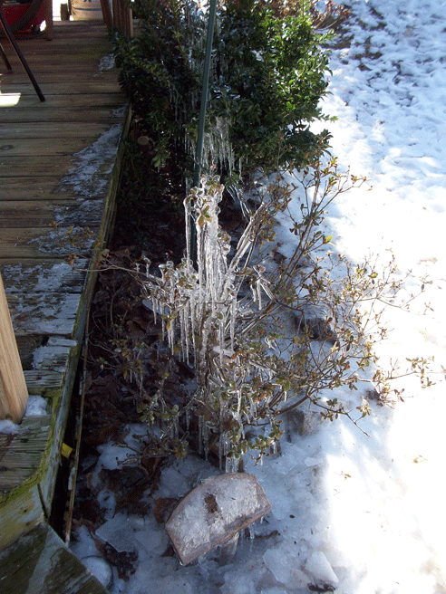 ICE! Yes, we still have ice in areas. Ice on the north side of the house, ice in the gardens, ice on my azaleas and evergreens: