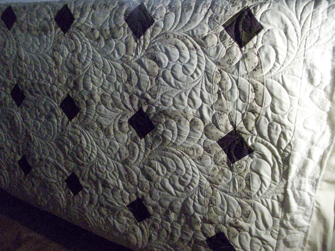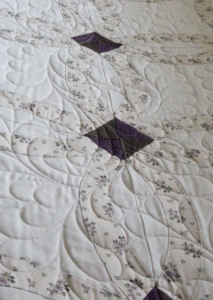 The cornerstones are high contrast, but they are small in comparison to the size of the quilt.  To blend the quilting we didn’t use a white thread, nor an off-white thread.  We chose to use a very light lavendar thread (So Fine #501 Barely Purple).  This thread being a 50/3 weight and not being white blended beautifully into the background, but stayed a bit muted on the dark cornerstones.