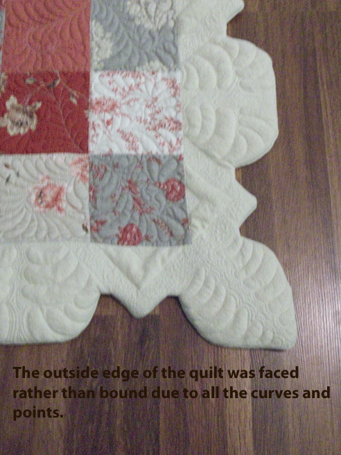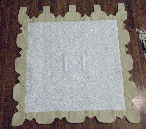 Finally the quilt was faced rather than bound and the hanging tabs inserted.  That allowed me to control the shape of the outside edge and did not put a line to stop the flow of the feathers as they come over the edge.  Binding would have created a visual line that would have contained the feathers within it.