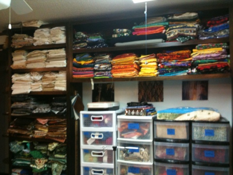 I started with sorting and folding fabrics on the shelves, while sorting out what I don’t use currently and what I won’t use. Fabrics such as novelty and babies I have no use for. Sheers and overlays I’m not using in my work right now. And holiday prints just don’t get used at all, so folding and sorting was started and it looks great: