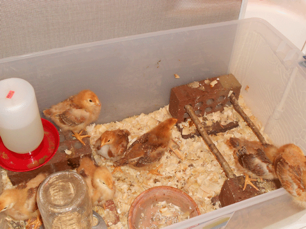 The box they were in was in the bathtub in the spare bathroom and it really wasn’t sized for 8 growing chicks.  It was the largest I could find that would fit in the tub: