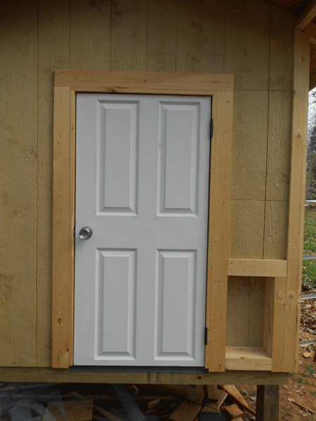 I’m really proud of M on this one!  The door was a $5 clearance deal at Lowe’s because it was dinged up.  But the dinged up part would have to be cut off to fit the entry, making this the best deal we’ve (he’s) ever gotten on a door.  Have you noticed yet, I’m not taking all the credit for this; or any?  This construction project was all his and I’m really happy with it.