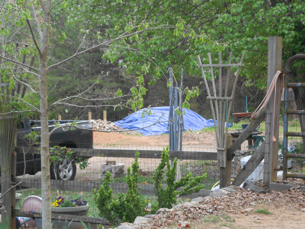 In other “things keeping me from fabric”, we’ve got this load of topsoil delivered that needs spread.  It’s under the blue tarp due to a threatening thunderstorm and M reminding me that dry dirt is lighter to shovel to spread than wet dirt: