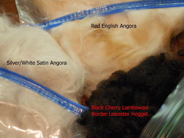 Isn’t it GORGEOUS! There’s 1.5 oz of the Satin Angora, 1.23 oz of the Red English Angora, and 4.5 oz of the lambswool. My plan is to wash/process the lambswool, then card them together and spin a fingering weight to make myself a pair of fingerless mitts. Hey, if I’m going to all that work, the end product is going to keep my hands warm and snuggly next winter!