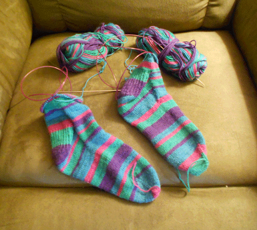 1. Gail, the yarn for the “hummingbird” socks is KnitPicks Felici Self-Striping yarn in the Hummingbird colorway. As they’re plain vanilla knitting, I decided to call them by the yarn colorway name. ;>)