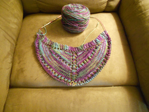 That is, of course, if I don’t allow myself to become too distracted by my latest shawl project.  I liked the variegated red sparkly shawl I made this summer so much for shape and fit that I decided to make another in wool yarn: