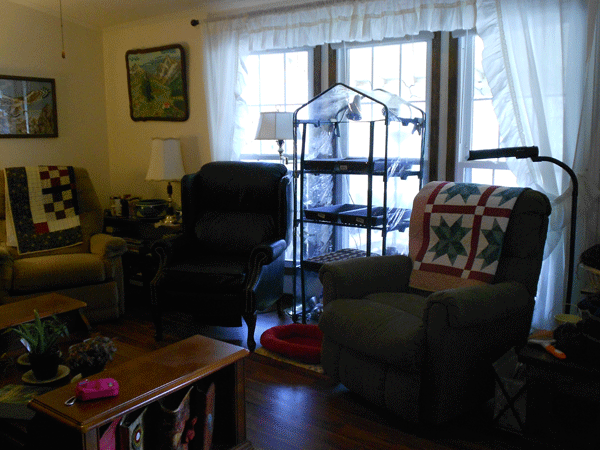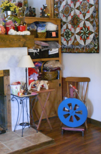 And it was bright enough with the sunshine that I had natural light all the way to the far corner of the living room where my wheel sits at: