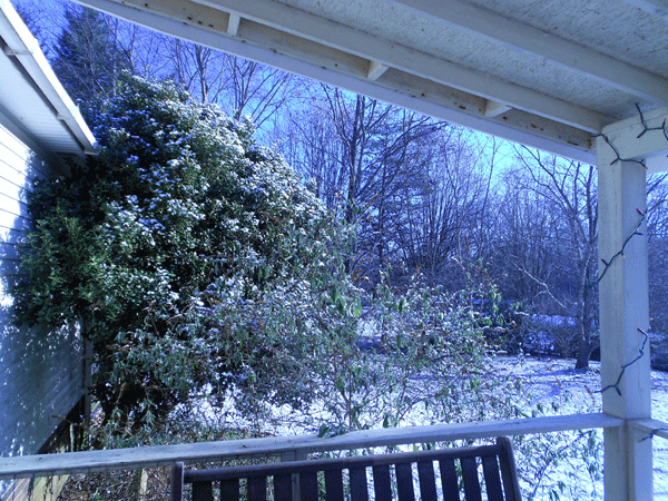 Then the snow came in last night. Although we didn’t receive nearly as much as South Charlotte did, we did get a little. Stepping onto the front porch this morning, it didn’t look too wintry: