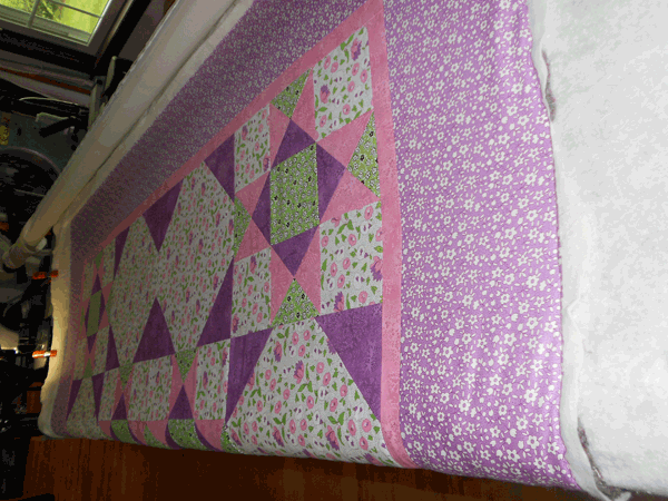 DSCN1382Having been able to completely secure this sandwich on the longarm, and baste down the sides to hold in place, I left the day with the quilt looking like this: