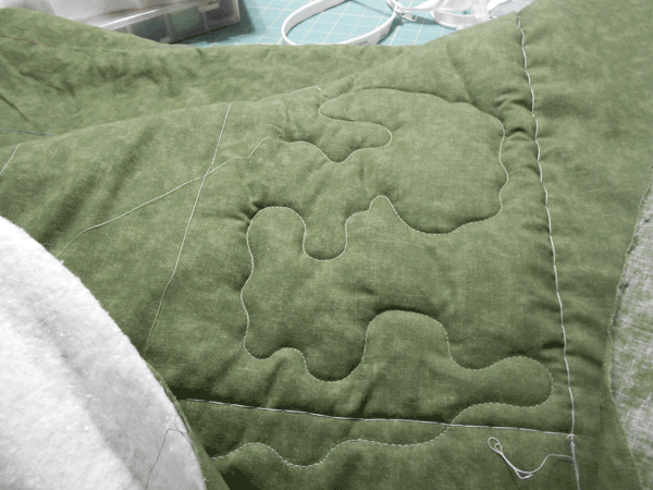 DSCN1385The puckering is unacceptable.  The stitch length is unacceptable as I try to maneuver around the biggest lumps.  But the biggest problem is the thickness.  Even with my hopping foot at the highest setting, and a size 21 needle, the machine was bogging down.