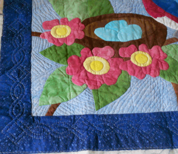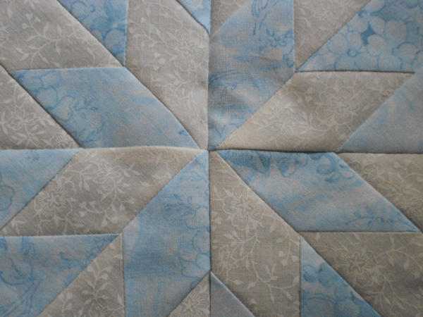 I had originally thought to hand quilt the entire thing.  Quite an ambitious project with the arthritis in my hands that I quickly gave up on.  I machine quilted the center and decided I would only do the borders by hand.  Finished one motif and gave it up for “another time” (UFO).  With the arthritis more under control now than it was back then, I spent one day hand quilting the remaining border motifs while away.  And while my stitches are far from the even tiny ones that I used to make years ago, I’m pleased that I can still hand quilt a little.
