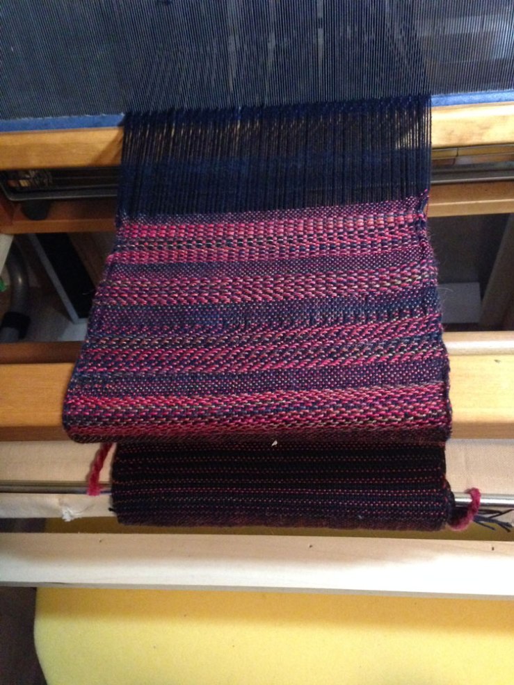 On the Leclerc Artistat floor loom, I’ve started a shawl. I’m using a silk/merino blend for the warp, with a tencel floating selvedge. So far I’ve used two different merino yarns in the weft, with a tabby tencel spacer between them. I know, foreign language to some of you, but the weavers out there will understand. I’m working this at 28″ wide for an end width after wet finishing of 25″ (hopefully).