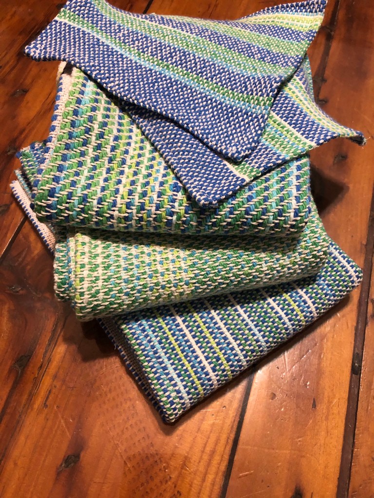 My loom is what I call a “happy place”, but in reality it’s a meditative centering place. And what did happen in my quest for calm is the completion of a set of dish towels with a few washcloths to go with. The washcloths are an experiment that is not yet fully successful, but improving.
