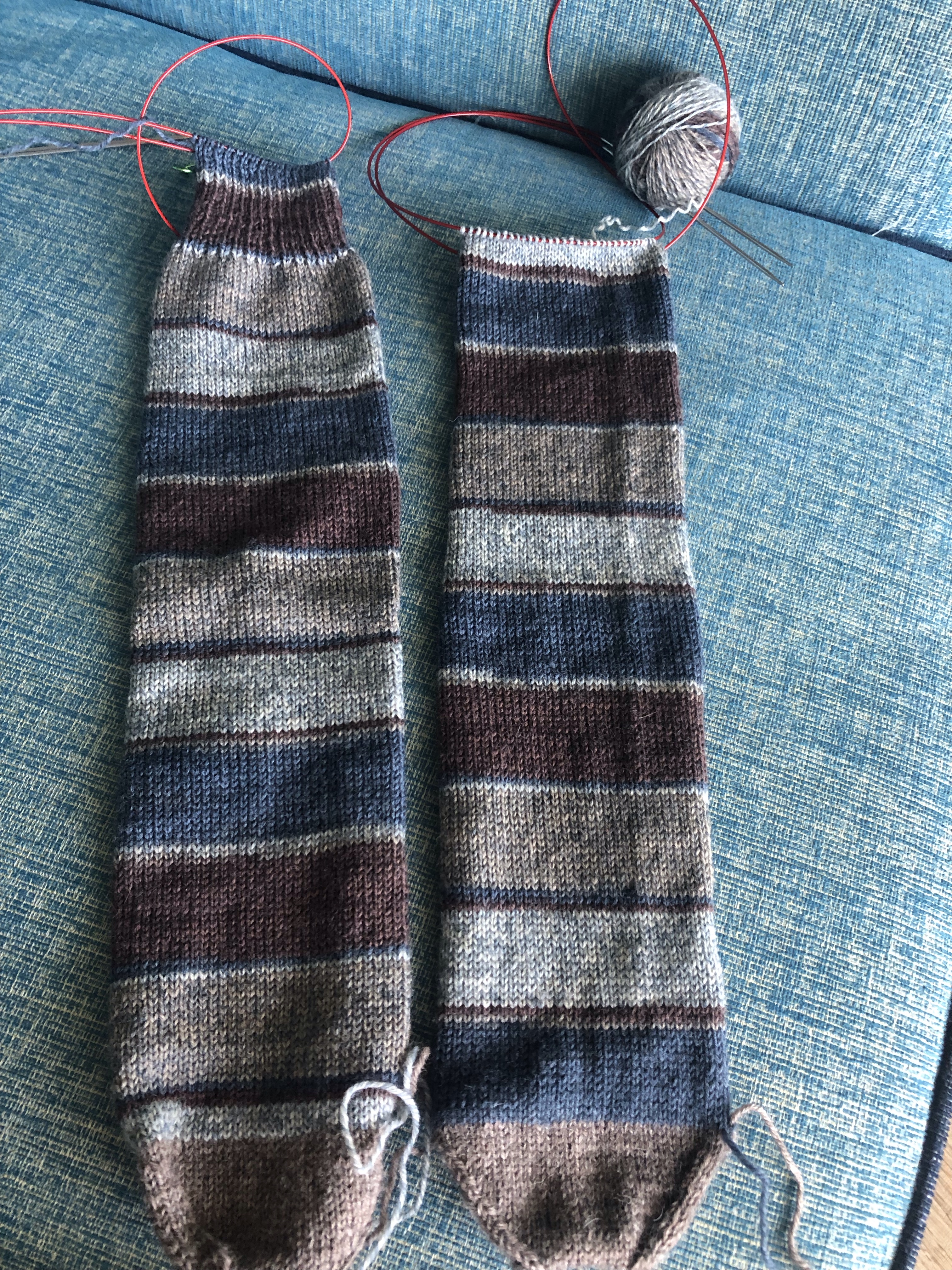 Worked a little on a pair of tube socks for DH. Toes are done, ribbing on the first is well underway.
