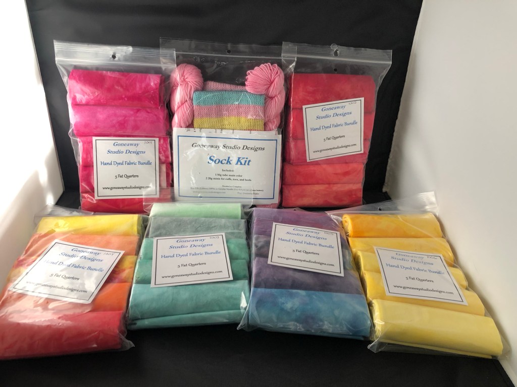 I’m selling fat quarter bundles of my own hand-dyed fabrics. Five fat quarters in a bundle for $17.50 (plus shipping). They’re one of a kind, and when they’re gone, they’re gone.