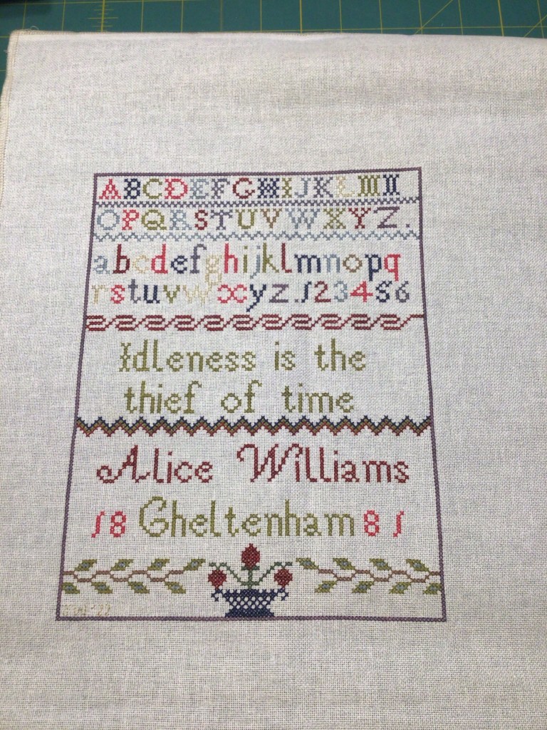 So I’ve come up with a plan for me. As of last night I took the final stitches in “Alice Williams 1881”, tomorrow on May 1st , I will be starting a new sampler. Not sure what yet, but “Coming to America” is a strong favorite. although there are a couple others that are contenders too.