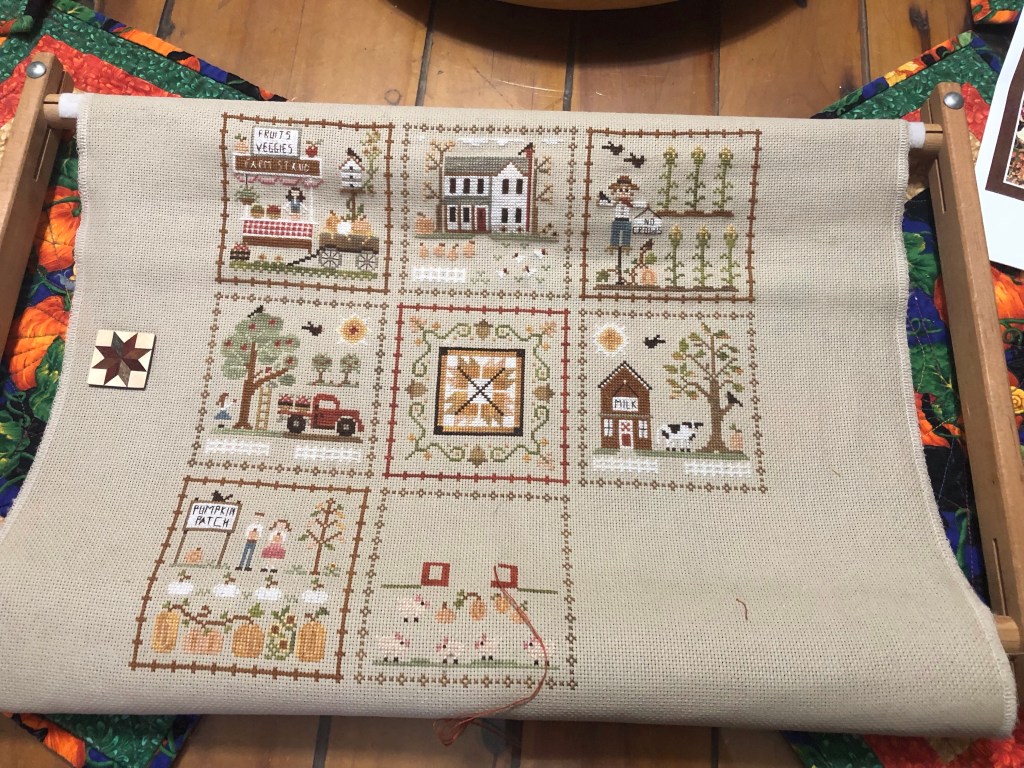 #3. Fall on the Farm. Had I kept up with this, it would have been fully stitched, but life (aka garden and yard) took up a lot of time this summer. Time that I fully enjoyed. Now it’s time to finish this and maybe display it before it’s Christmas decorating time, maybe…….