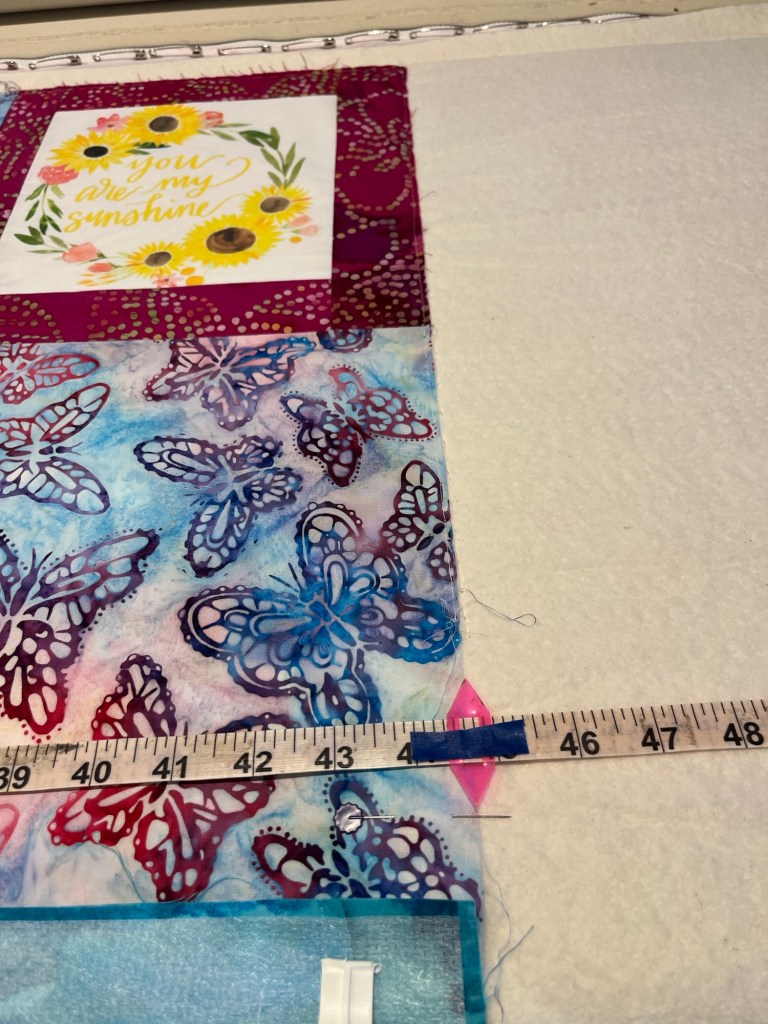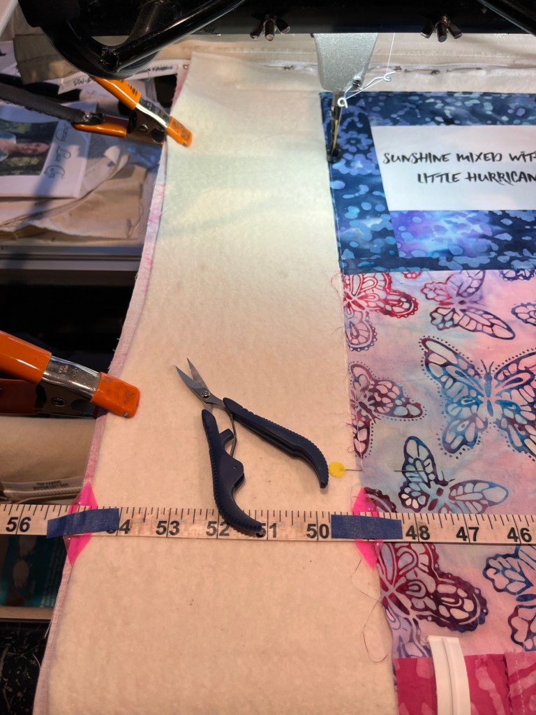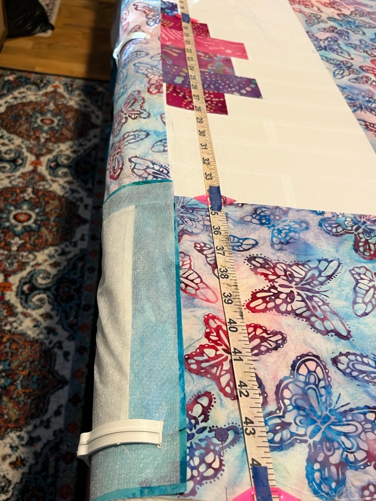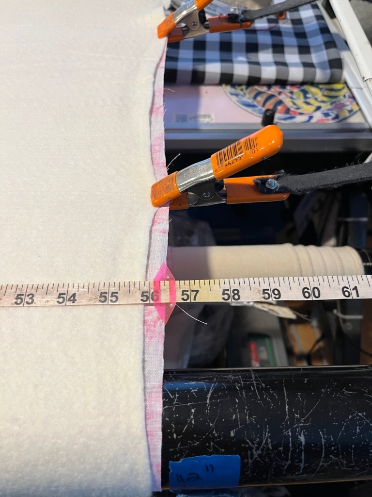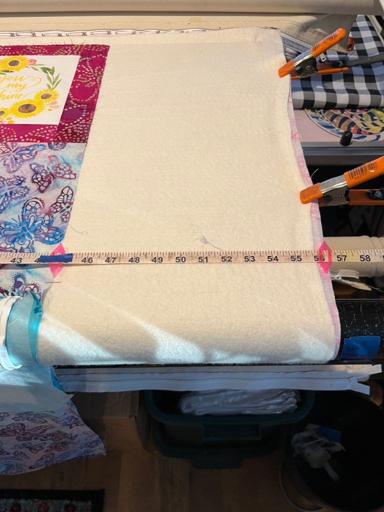 The tape measure is a center zero, but as this quilt isn’t centered on the backing, the zero part isn’t relevant. It’s not centered as the backing is a wide back and the best way to conserve usable fabric for this customer is to offset it on the longarm.