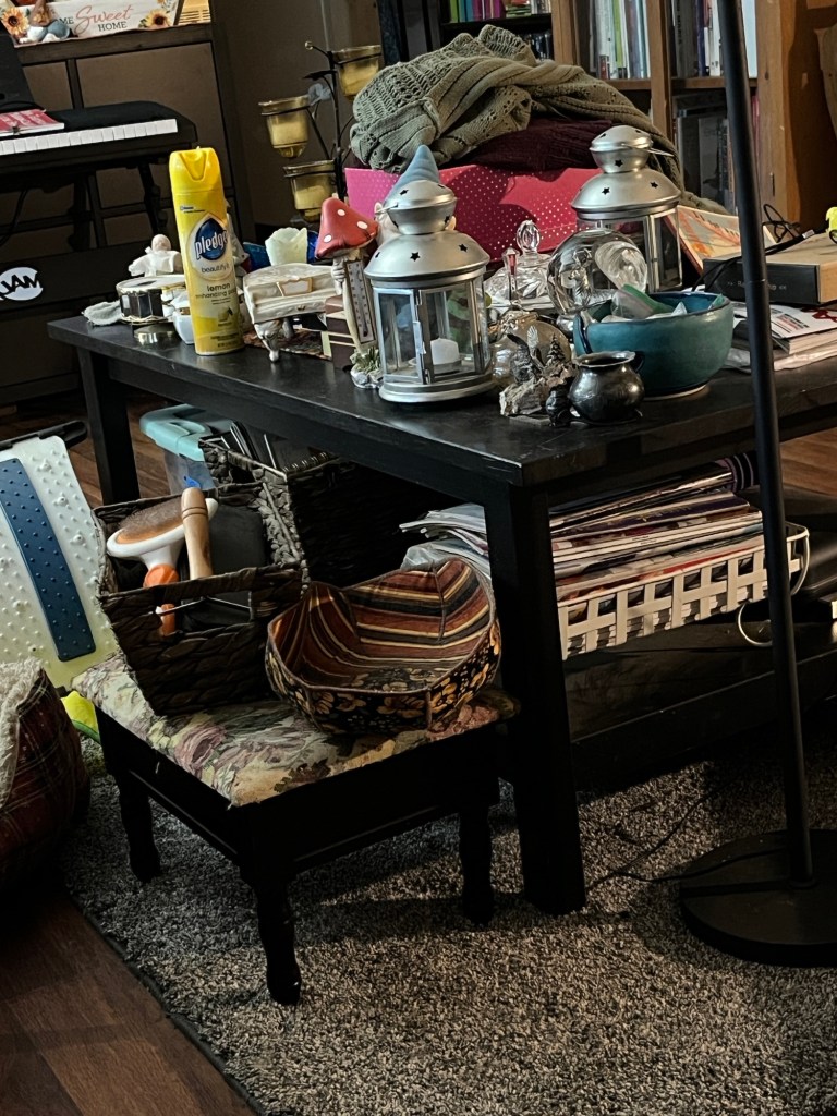 The table is covered with the “needs put away” stuff.