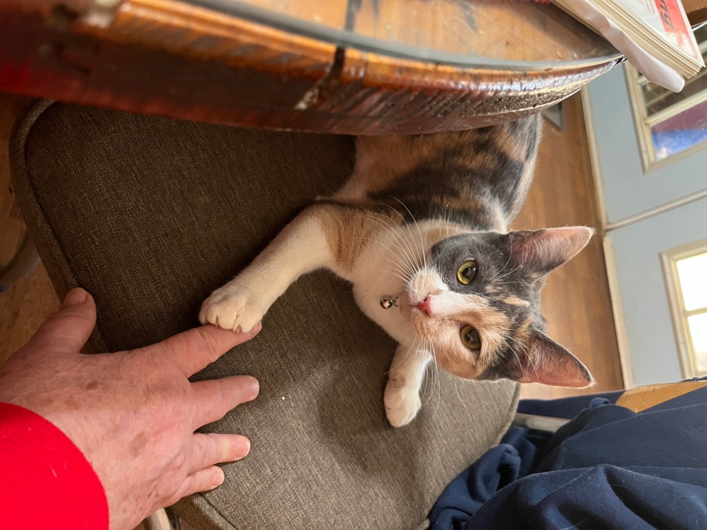 In a few days I’ll decorate the tree. I’m giving the kitten time to adjust and prove she won’t climb it. So far, so good she’s more interested in people.