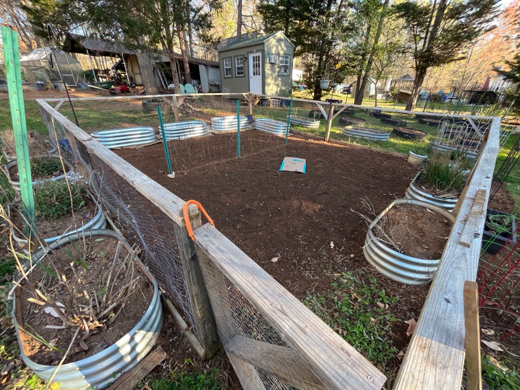 We have weeded all the tires in the background. I think I’m going to experiment with some corn there this year. Then yesterday we did the fenced in area. It got weeded, then tilled, then the four new metal raised beds were put together and set in place. They still need filled. The remaining weeds by the gate will be removed once the gate is replaced with a larger one that the wheelbarrow will fit through.